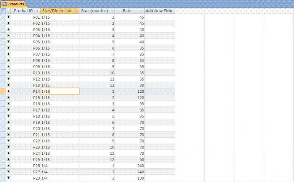 The Productstbl lists all the possible combinations of Size/Dimensions, Terms, and Rate. Although there are only 5 different Size/Dimensions a customer can order, there are 61 different combinations of terms and rates. I’ve attached a print screen of the Productstbl. In terms of the subform, my questions are: