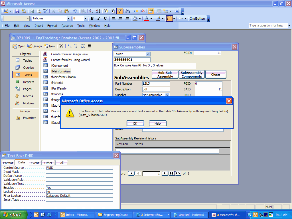 I know, I deleted a lot of forms and queries so that I could post the database. The error occures when entering the data. The parent/child link is not working and when entering another record or saving the record I get the attached error. (I also had to resestablish the data source for the SAID field on the subform)