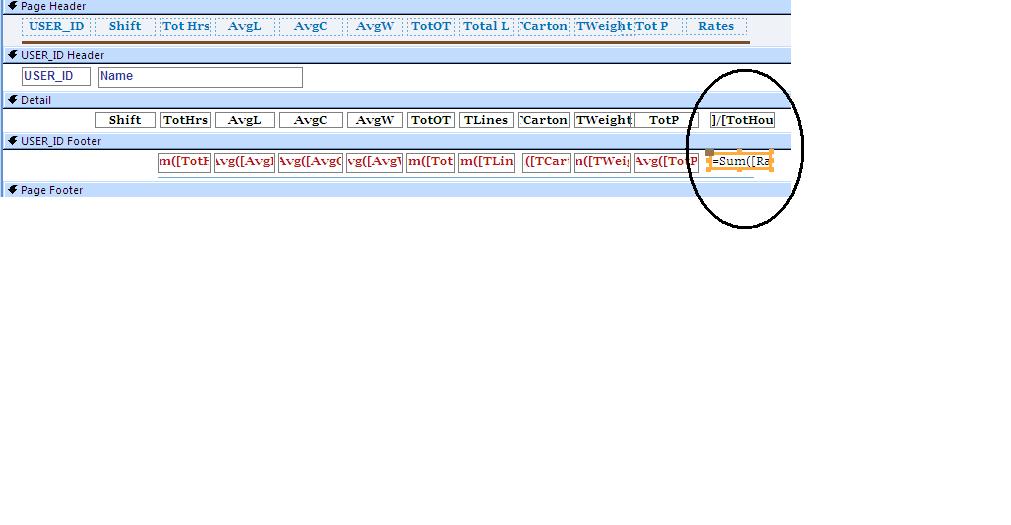 I'm in a complete lost, something that should be easy, but I can't get answer.. I have an access report that there is One column among 9 of them, refuse to give answer.. Its suppose to Sum all the total of each line in the column. See Attachment. This report is group by ID and sort by Shift. The formula is: Sum([Rates]), and the Rate is list in Details Report where the Sum ([Rates]) is located in Id Footer section. "see attachment". What did I don wrong here?.. any idea would be so greatful..