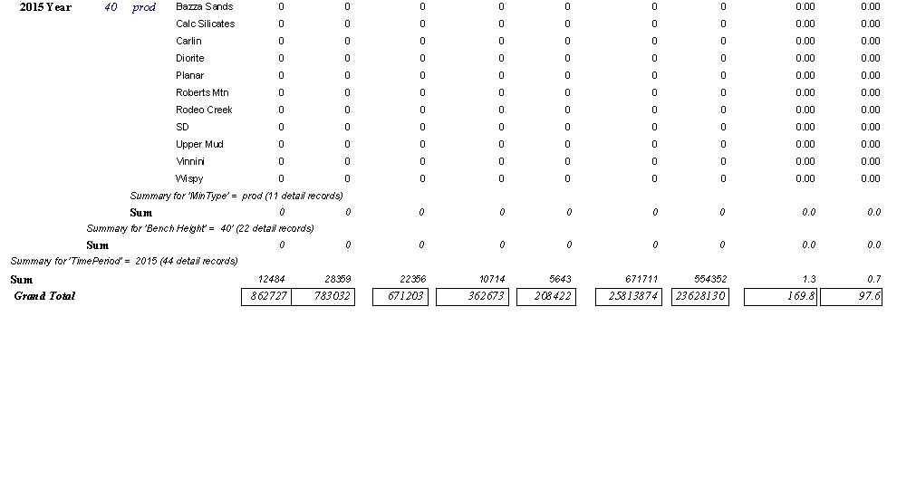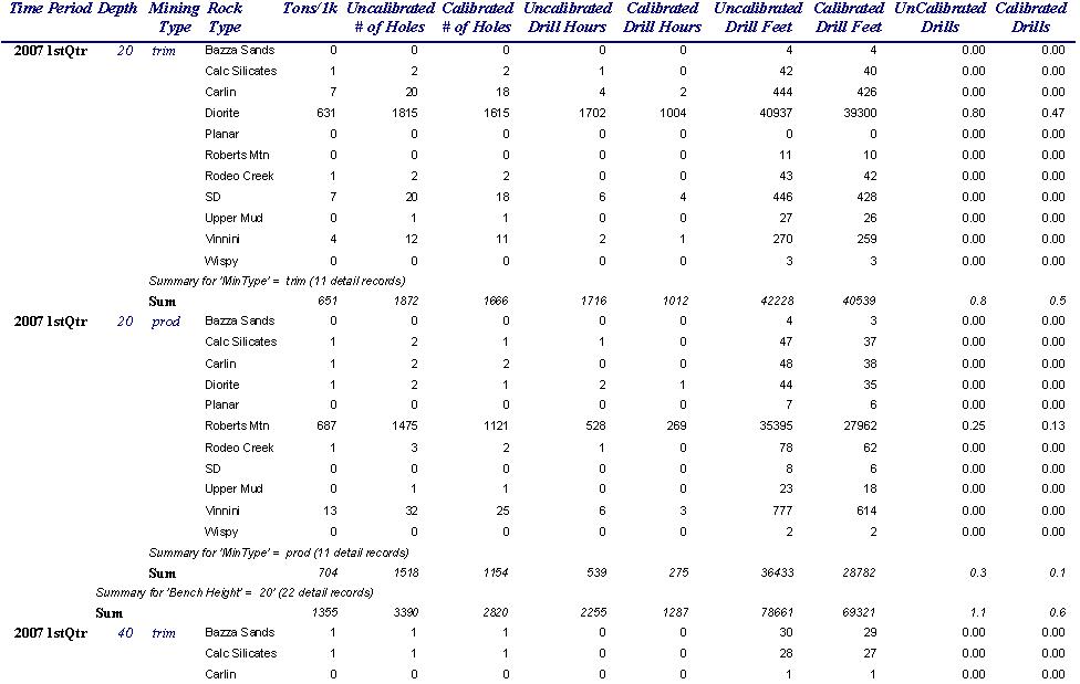 So the data giving me problems is the last two columns, the Average Drills per time period, and only in the report footer, summaries up to that point appear correct as far as I can tell. Unfortunately, the time periods are sometimes quarters and sometimes years, so I cannot merely do a linear average. What I need is the average drill requirements per year over the life of the project in the report footer. So somehow I either need to pull the average drill number for the year, out of the footer that calculates that value for the first two years, or I need to recalculate it in the report footer so that all of my values are in a consistent timeframe, ie: average drills per year, and then take the average of those numbers.