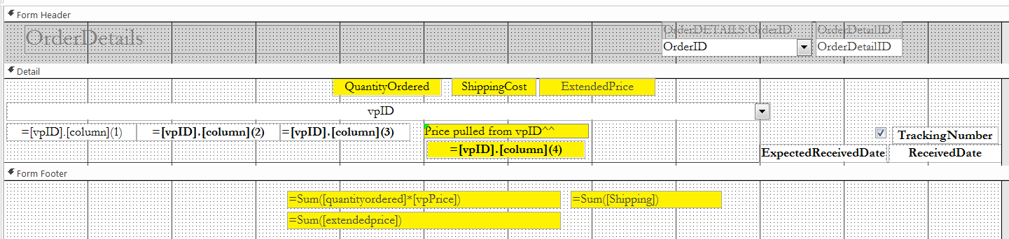 SELECT OrderDETAILS.OrderID, OrderDETAILS.OrderDetailID, OrderDETAILS.QuantityOrdered, OrderDETAILS.vpID, OrderDETAILS.ShippingCost, OrderDETAILS.TrackingNumber, OrderDETAILS.ExpectedReceivedDate, OrderDETAILS.Paid, OrderDETAILS.ReceivedDate, [QuantityOrdered]*[vpPrice] AS ExtendedPrice, EquipmentDETAILS.vpPrice, EquipmentDETAILS.vpPartNumber, EquipmentDETAILS.vpPartDescriptionID