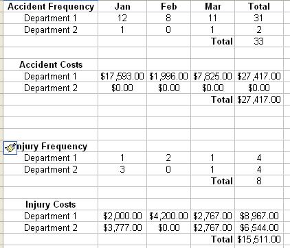 I need a report to mimmick, or at least closely resemble a spreadsheet that we currently use to recap our accidents at the end of each quarter. (See attachment to see what this looks like)