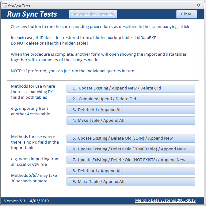 Each method is used to synchronise a table tblData originally containing 200 records with another table tblImport containing 20,000 records.