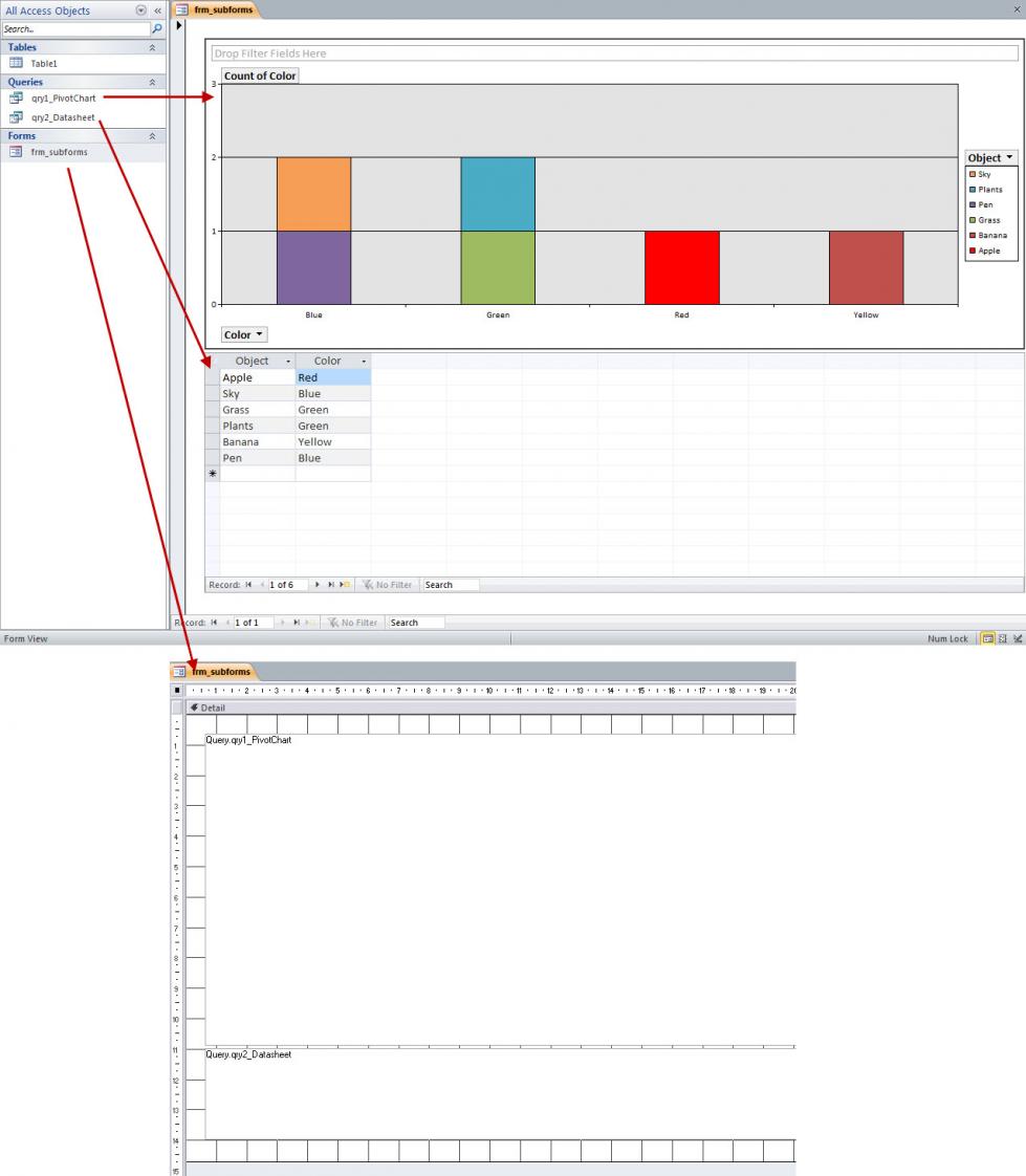 I've made two queries. One in PivotChart and one in Datasheet view. Then I added both to a form.
