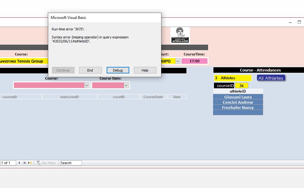 Also i would like my subform to show athletes registered in the specific session when chosen from "Fr_CourseSessions" and maybe a more efficient