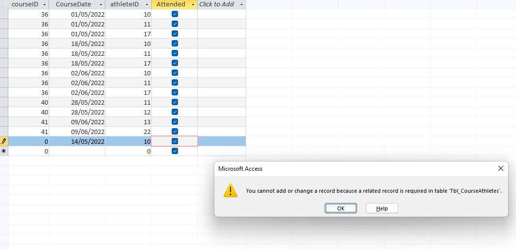 I would like to fill rows to Tbl_CourseAttendances for athletes registered in tennis course sessions filled from the above form "Fr_CourseSessions"