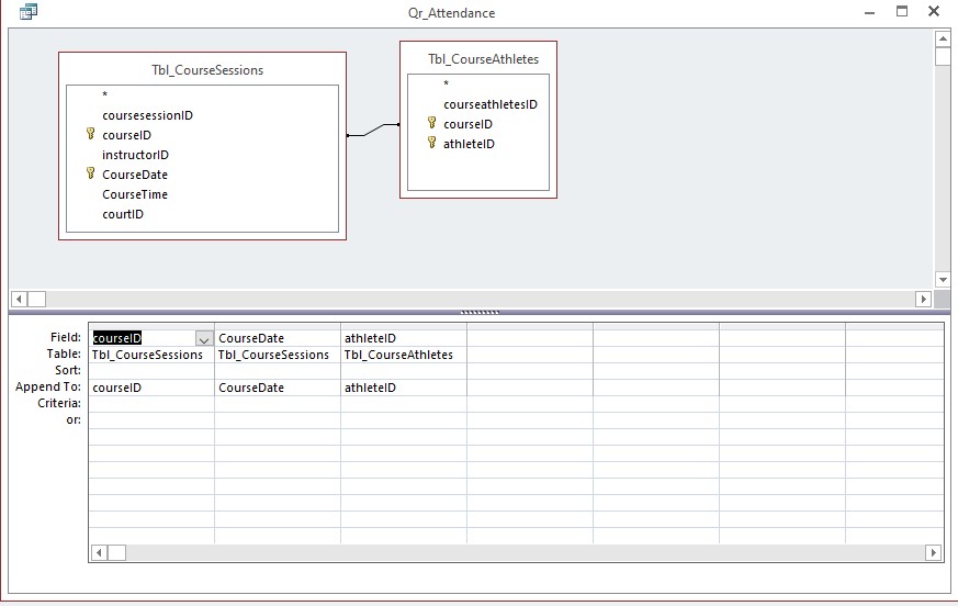 SELECT Tbl_CourseSessions.courseID, Tbl_CourseSessions.CourseDate, Tbl_CourseAthletes.athleteID