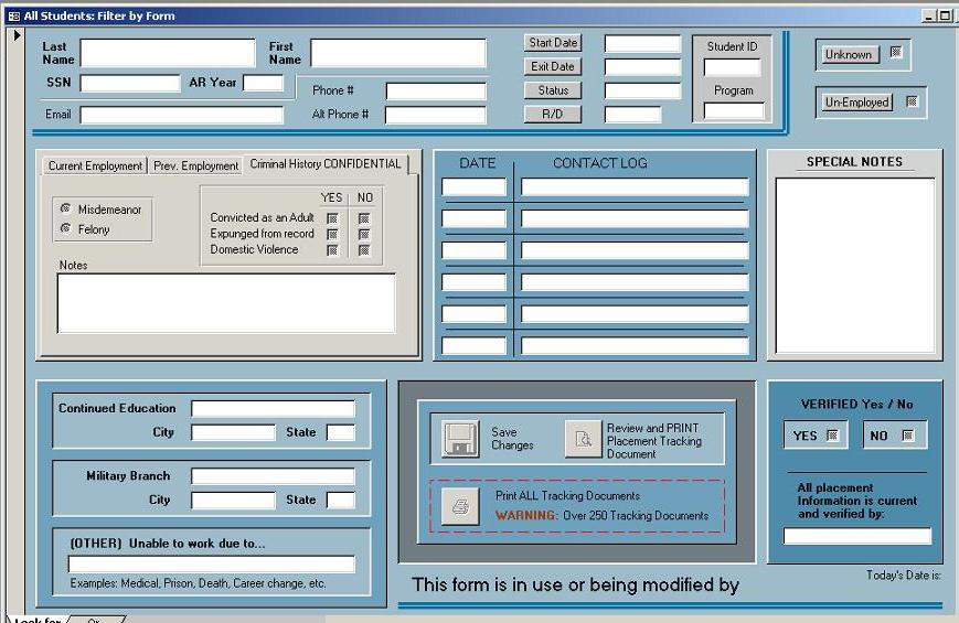 I believe thats the proper word for it. Attached is a screenshot of a section of the database that I have started working on. It is to track placement for a college. Its my first ever and I am fairly good at making things look good, but as far as function - I am terrible.