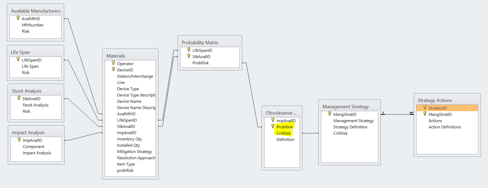 My goal is to have eventually have a form based on the table Materials automatically display the "ProbRisk" and "CritRisk" based on what's selected in "LifeSpanID" and "StkAnalID".