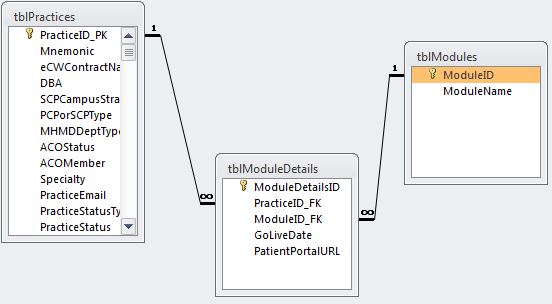 Hello again. I would like to pick our brilliant minds regarding how to set up a few tables. Currently, I have three tables (tblPractices, tblModules, tblModuleDetails). I have attached a picture of the relationship to the post.