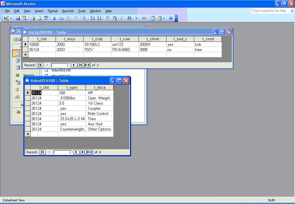 I'm trying to create a string of text that has two fields and 5 records. I have two tables. The first with all the specifc info on(lot #, Serial Number, manufacture, and etc.). My second table has the equipments specific descriptions. First line is for instance [26124][168][hp]. the 2nd record is [26124][31590lbs.][Oper. Weight] and such. I want to create a query where my first field is [26124]and then ["168"& "hp"& ", " & 315920lbs. " & " Oper. Weight"] My actual table and field names names are ttscfg200100.t_clot and ttdext816100.t_clot, ttdext816100.t_spec, ttdext816100.t_dsca. What I'm hoping to achieve is shortening my time involved with getting to the printers my equipment descriptions. Any help on the sql of this?