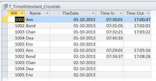 Open the attached database and run the query "T_TimeAttendant_Crosstab", below is insert a picture which shows the query result.