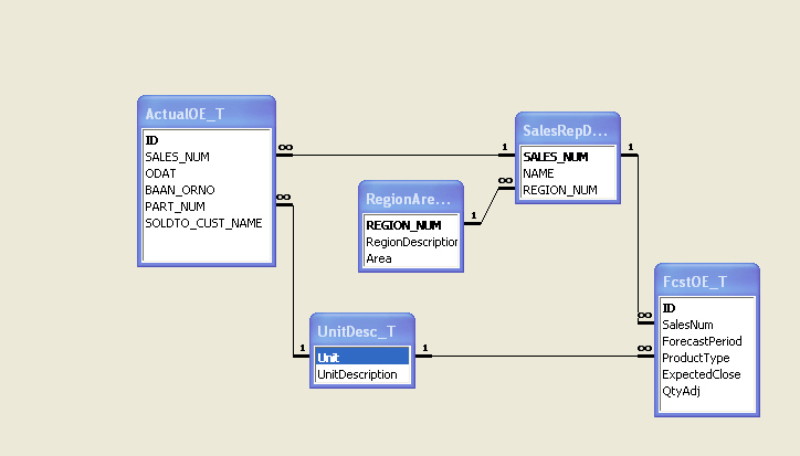 I am attaching a pic of my relationships page to show the table structure I am dealing with. What I need to do is match forecasted values with actuals based on the same date range, sales_num and unit.