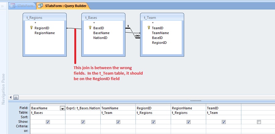 You have a number of invalid control sources on the form, but the error comes from a join in the source query, from RegionID to TeamName.