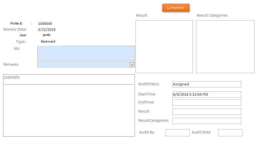 NB: I can get only 1 record at a time since there is a timestamp (StartTime) when the record is loaded. When the "Complete" button is clicked there will be another timestamp (EndTime).