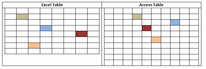 I showed a physical example of changes in Excel and how is corresponds to Access table field changes as seperate image. Note: The 1st row is a header for both Excel and Access.