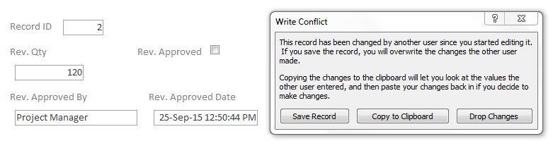 I'm trying to update a date field as soon as Check Box 'Rev._Date' change its status, checked or unchecked. But every time a write conflict box is appearing, attaching screenshot. Rev._Date is updated only if i press 'Drop Changes' button.