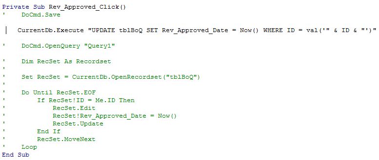 Both check box and Rev._Date fields are in same table, so I'm understanding bit that VBA is trying to change a field in a table while it is already in edit mode by me. But i don't know how the fix it.