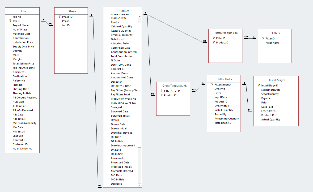 I've been asked to work on a new "Installations" section of our database. I didn't design the database itself, so it's always a little difficult to make sure anything new that is implemented works as it should. I won't bore you with all the details regarding the new section as our set-up is a little different. However, The outline basically means we can issue our fitters with what we're calling a "Fitter Order Ticket", which is linked to a job on our system and then to a specific Product within that job. The Fitter Order is linked by