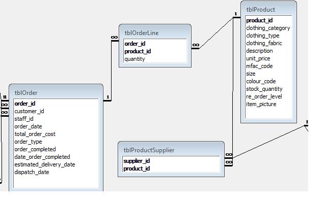Related Tables / Attributes has been attached. Just to explain the relationship - an Order can have many orderlines, an orderline can consist of many products of multiple quantity.