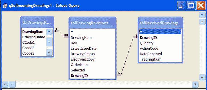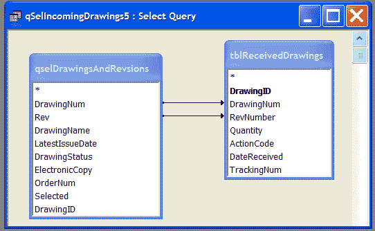I can import the drawing and revision information into my database. Then when hard copies are received by the company I need to add the information in tblReceivedDrawings. The form is based on a query that joins the 3 tables (see screenshot attached). Adding info for drawings already in the DB works fine.