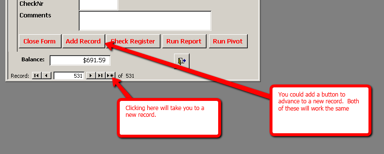 You could add a command button to say New Record. The Command Button Wizard will allow you to do this. Alternatively, you could use the arrows at the bottom of the form