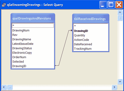 The form is based on a query called qSelIncomingDrawings. This query joins qSelDrawingsAndRevisions and tblReceivedDrawings. It shows all the records from qSelDrawingsAndRevisions and related records from tblReceivedDrawings and is joined on the drawingNum and Rev.