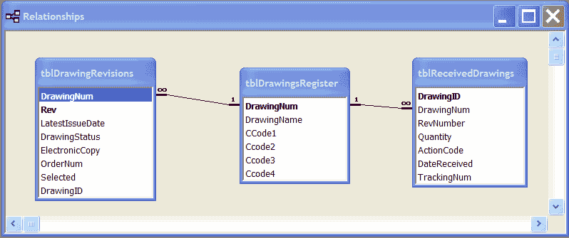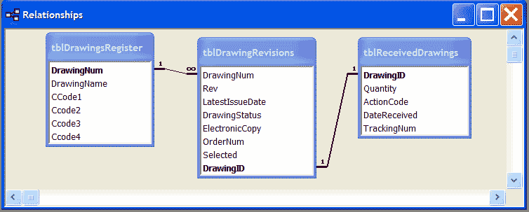 It is a database of engineering drawings. A drawing can have one or more revisions. I have written code to import the drawing and revision info into the datebase so when the drawings are actually received I need to be able to add the additional data in tblReceivedDrawings such as the tracking number, date received etc.