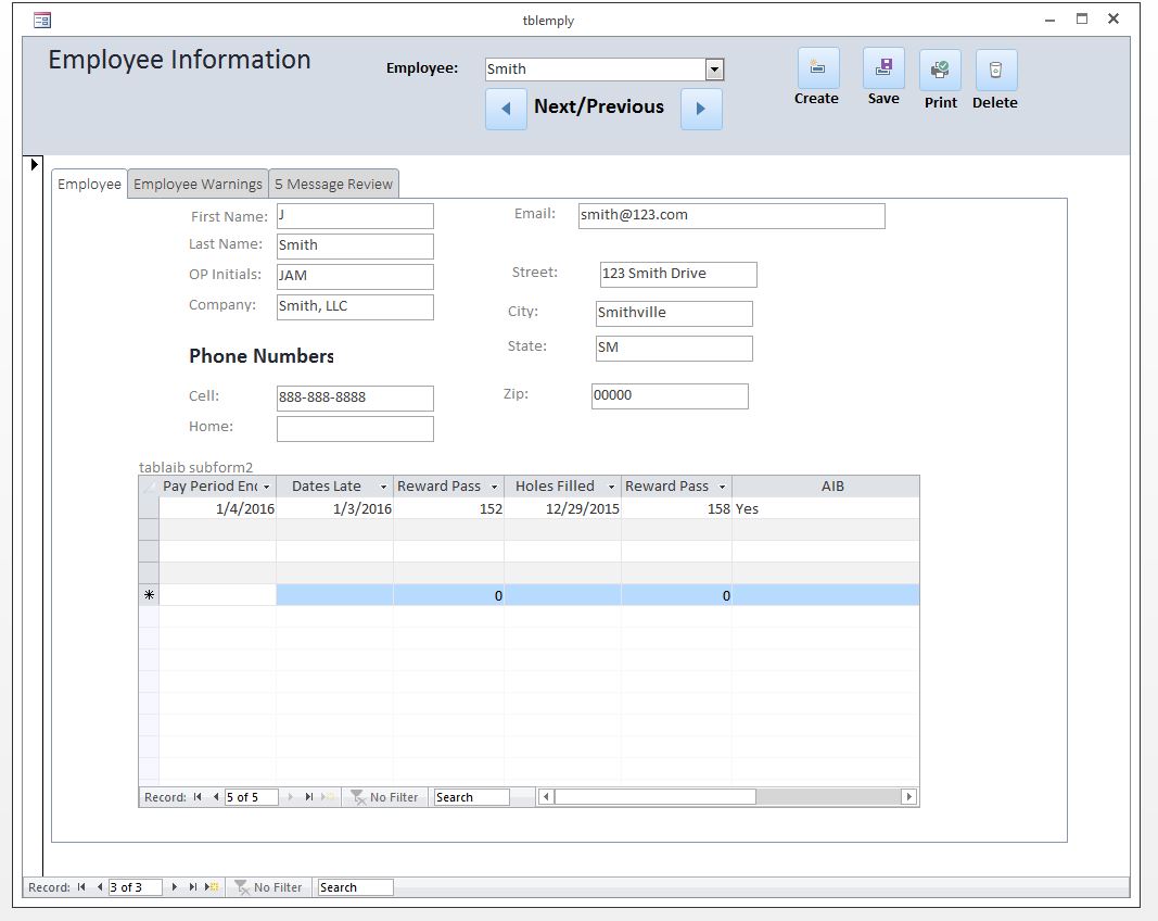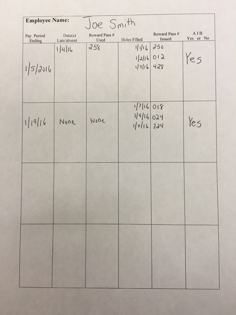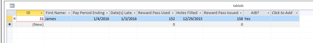 Attached is a sample table that I'll use when the pay period ends for my employees. We have an attendance incentive program, and I plan to use this to keep track of the program. The table works for me, with the exception that the Date(s) Late column, Holes Filled column, and Reward Pass Issued column can have more than one number or dates. Basically, I can issue several reward passed and would want to capture that data in the single field.