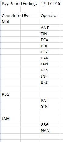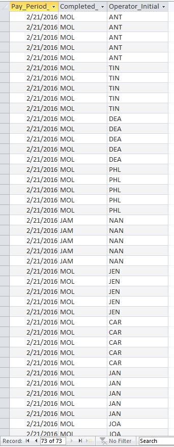 Because each Operator has 5 calls reviewed, their Operator name and Completed by appears 5 times along with the pay period ending date. (See attached pic labeled 5 Message Query).