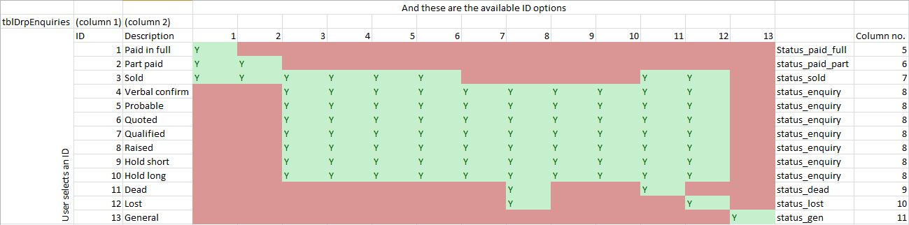 I have created a new table (tblDrpEnqOptions) which links the ID field from tblDrpEnquiries to a range of available options (see attached screenshot).