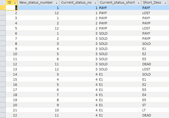 the combobox now updates on focus so the dropdown list reflects the options available (based on the current status textbox) but only shows the 'new status' column from the previous posted table image. The short/long/full description columns all appear blank?