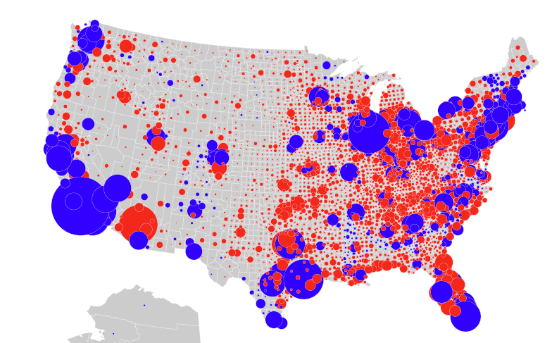This map is the reason that the Electoral College is important. It shows that support for Trump (in this case) is widespread whereas support for Clinton (this was the 2016 map) is restricted to large population concentrations. The Electoral College mitigates the importance of the large cities and gives the rest of the country a chance.