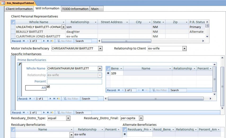 I have tried the Alt_Bene checkboxes lostfocus event. But if I check the box and then go outside the Specific Inheritances form, nothing is triggered. Next I tried the subform controls Exit event, but that doesn't trigger either. I have even tried the Prime Beneficiaries subform's lostfocus event, and still nothing.